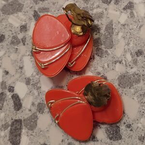 If orange things make you happy, you'll be delirious with these brilliant earrings. Lovely layered vibrant vintage orange plastic clip earrings with gold trim. Brass clip backs. Measures about 1" wide and just over 1" long each.