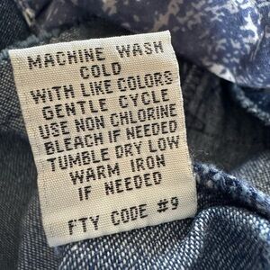 Hem: The hemline features a printed or patterned fabric detail, likely in shades of blue and white, adding a contrasting element to the solid denim.