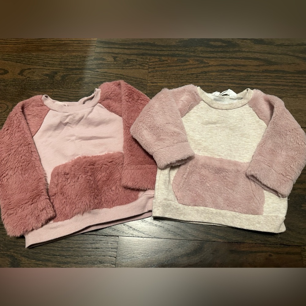 Baby girl size 6/9 months. Set of two beautiful pullover furry sweaters. Both Rene Rofe brand. Pretty cream, mauve and pink colors. Furry pockets and sleeves. These are both 6-9 months buts the last picture shows that one is a bit larger than the other, particularly in the sleeve length.