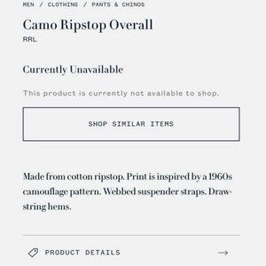 $690 RRL Ralph Lauren Large Tiger Stipe Camo Overalls