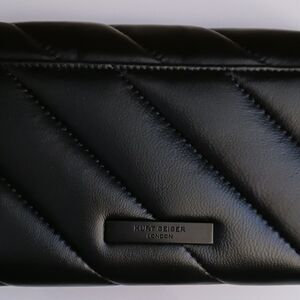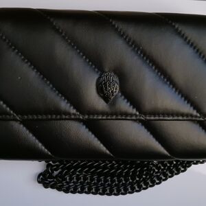 Add to your style with the Black Leather Chain Wallet by Kurt Geiger. It is quilted black leather with a matte finish removable chain handle, so it can be worn on the shoulder or held like a clutch. It has the crystal embellished Eagle head logo on the front flap, which secures using two snap closures. There are two interior sections divided by a zipper compartment perfect for change. There are six credit card pockets on the back interior section and an open pocket on the back exterior. It's the perfect fit for a casual outing or a special evening event. Perfect for any occasion, this sleek wallet combines elegance with functionality. This piece is from my personal wardrobe and has never been used/worn.