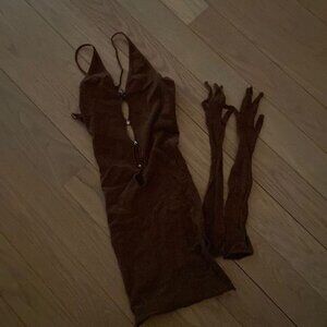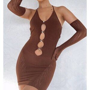 The Link Up Mesh Mini Dress in Chocolate exudes main character energy. This stocking dress features halter neck style, mini length, criss-cross back design, cut-out bust/midriff design with diamanté detail. Matching gloves are included with this dress. This is a delicate sheer fabric with stretch so one size fits most.