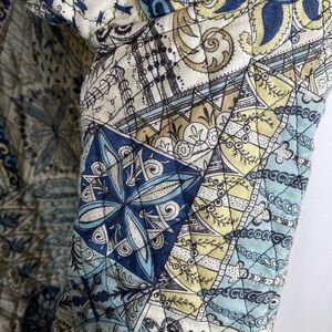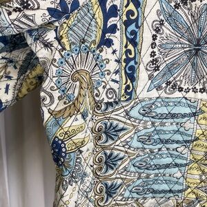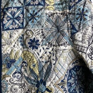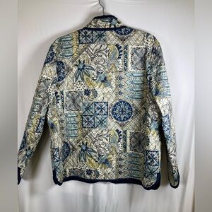 Stylish quilted jacket with intricate patterns various floral, paisley, and geometric prints. Can be reversed to be a solid blue hue. Features blue and yellow tones. Perfect for layering and adding flair.