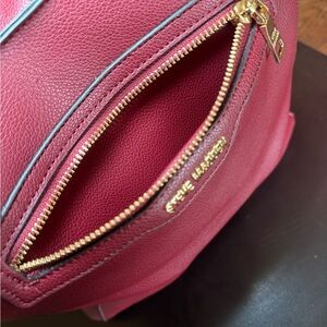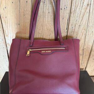 Chic and functional Steve Madden large tote and crossbody set in a beautiful deep burgundy pebbled faux leather. Features gold-tone hardware, front zipper pocket with logo detail, dual handles, and a detachable adjustable crossbody strap (still wrapped in protective plastic). Includes matching zip pouch.