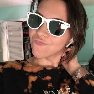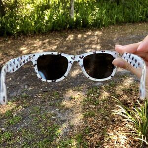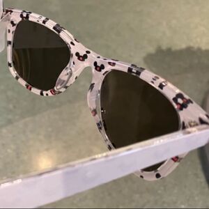 White outer frame, inside has Beautiful mickey hats all over ๐๐ excellent used condition! Last photos show in detail all of its imperfections but none are noticeable to you or others when wearing, and frame is in excellent condition! Ray Ban style!