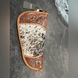 Stylish leather and cowhide pistol case with intricate floral design. Features brown leather and black and white cowhide pattern. 8" W 15" H