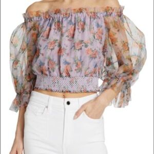 Alice + Olivia's Caprina silk crop top features an off-the-shoulder neckline with voluminous sheer puff sleeves. A smocked waistband completes this romantic style.