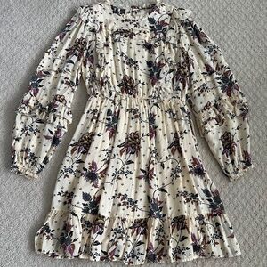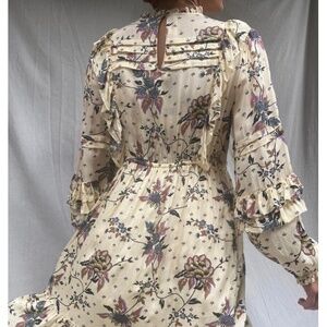 Scotch & Soda Floral Print Ascari Midi Dress - Cream - Flowy/Feminine - Size Medium. This gorgeous dress features soft fabric in cream with autumnal toned floral print, high neck with button closure and keyhole opening in the back, ruffle frills on the bodice, sleeves, neckline, and bottom hem, elastic gathered waist, blouson sleeves with elastic cuffs, side seam pockets, and lined with 100% organic cotton fabric. This dress is lovely and perfect for any occasion! Excellent pre-owned condition - LIKE NEW!