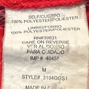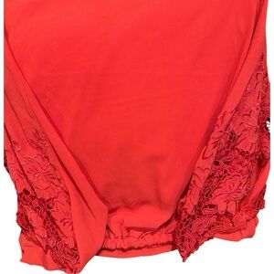Stylish scarlet blouse by XOXO. Features elegant lace sleeves. Perfect for any occasion.