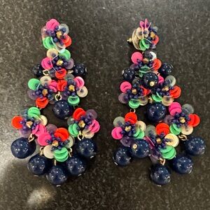 Vibrant statement earrings with multicolored beads. Perfect for adding a pop of color to any outfit. Fabric backing, light. 3.5” long, 2” at widest. No missing beads or sequins