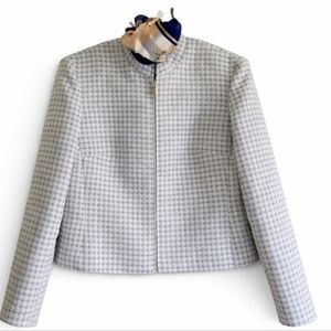 Embrace elegance with a classic jacket that features a convenient zipper closure and striking silver hardware. This graceful short jacket is a celebration of comfort and sophistication, designed to inspire confidence in every step you take. With its lightweight fabric and lightly padded shoulders, it offers an effortlessly chic look that feels as good as it appears. The delightful gray and off-white polka-dot pattern adds a touch of whimsy and charm, encouraging you to express your unique style. Fully lined for a luxurious feel, this piece is crafted from 100% comfortable polyester—ideal for those who appreciate both beauty and ease. With a pit-to-pit measurement of 18", a length of 21", and a sleeve length of 26", this jacket is thoughtfully designed to flatter a variety of body types. The rounded collar adds a unique and sophisticated touch, making it perfect for layering or wearing solo. Whether you choose to wear it alone or under a blouse, mock neckline sweater, or dress, this vintage-inspired jacket is an invitation to explore endless styling possibilities. Its versatility allows you to transition seamlessly from casual outings to more polished events, pairing with tailored trousers or a flowing or pencil skirt. Canadian Designer. Bundle and Save ⭐️ #canadianvintage #quiet-luxury Tags : quilted cropped jacket white gray geometric jacket structured