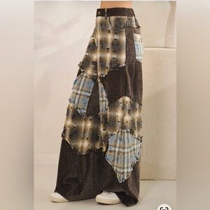 unique patchwork, plaid, and animal print wide-leg pants. Features a blend of brown, blue, and cream tones. Cotton 70%, polyester 25%, and spandex 5%. Small waist flat 14”-17” stretched. Rise 12”. Inseam 29.6”. Medium waist flat 15.5-18.5”. Rise 22”. Inseam 29.5”. Large waist flat 16”-19” stretched. Rise 12.5”. Inseam 30”. Xl waist flat 17.5”-20.5” stretched. Rise 13”. Inseam 30”.