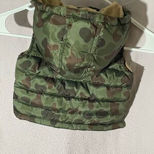 Chic baby vest with camouflage design. Features a secure zip closure. Made with water-resistant fabric.