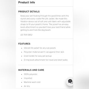 Pet Life Jacket, new with tags from Eddie Bauer, see tag in picture for measurements.