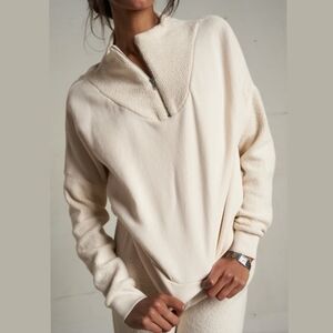 White terry fleece funnel neck pullover with green color block trim. Polyester. Size Medium. Excellent condition