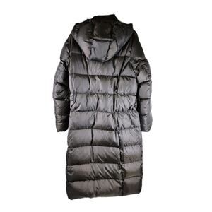 Stay warm in this premium Eddie Bauer long puffer coat, filled with 650-fill power goose down for exceptional insulation and comfort. Features a full-length design for superior coverage in cold weather, a removable/attached hood (appears attached), snap + zip front closure, and two snap-flap pockets.