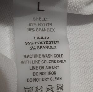 The shell is 82% Nylon and 18% Spandex. The lining is 95% Polyester and 5% Spandex.