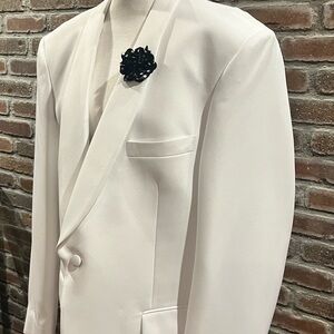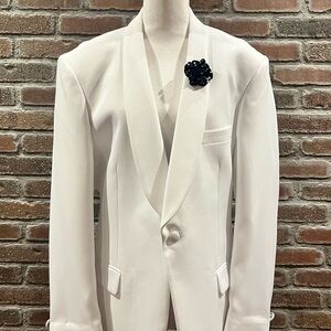 This sophisticated white blazer features a stylish black floral boutonnière, perfect for formal occasions. Its sleek design offers a modern touch to any wardrobe.. MULTIPLE SIZES AVAILABLE - please ask!