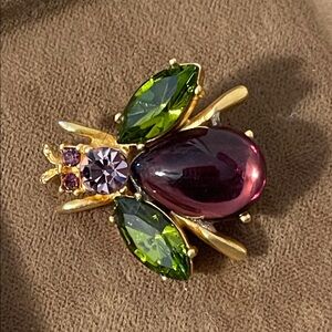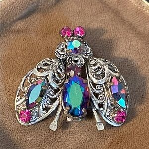 Vintage Roman stamped Art Deco style brooch showcasing a beautiful geometric design alongside multi-colored metallic enamel and a black glass cabochon. Measures 1 1/2” x 1 1/2” with a secure roll-over clasp and is in excellent condition.