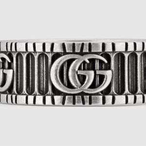 Design: A contemporary take on an archival 1970s Gucci belt design, this sterling silver band features a repeating three-dimensional Double G logo combined with engraved stripes.