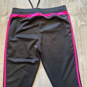 Adidas leggings in sleek black with bold pink accents. Ideal for active wear.