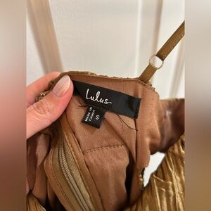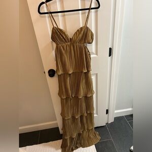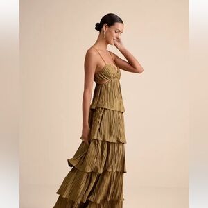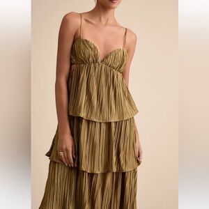Lulus Kanya Gold Satin Plisse Tiered Maxi Wedding Guest Dress