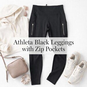 Athleta black performance leggings with an ultra high rise fit and sleek zippered pockets—perfect for workouts, walking, travel, and everyday athleisure. Supportive stretch fabric with a smooth feel and secure waistband. Zipper pockets add function and a sporty, streamlined look. New without tags.