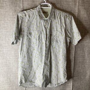 The Poncho Men's XL Camouflage Magnetic Snap Button Shirt is a versatile outdoor garment perfect for nature enthusiasts, fishermen, or military personnel. Made from a durable blend of nylon and spandex, this woven shirt features a classic button-up style with a button-down collar and long sleeves. The shirt is designed with vents and pockets for added functionality, making it ideal for all seasons. The camouflage pattern in green adds a stylish touch to this practical and rugged piece, which is sure to become a favorite in any man's wardrobe.