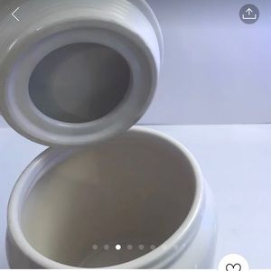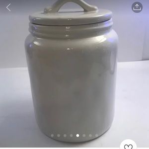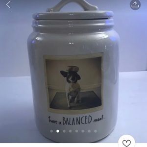 Rae Dunn food canister with a doggie picture and the words “have a balanced meal” while he is balancing something on his head. This item is unique each piece is different they are handmade, the shapes and imperfections are actually what makes these pieces special