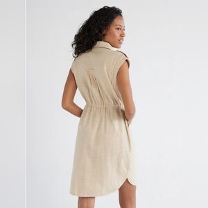 Stylish beige mini dress with a drawstring waist. Features cap sleeves and button-up front. Ideal for casual wear.