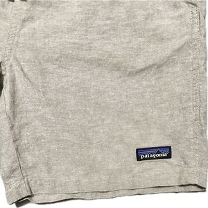 Patagonia men's gray shorts with elastic waistband. Material is organic cotton and hemp. Features drawstring for adjustable fit. Lightly worn, in great condition.