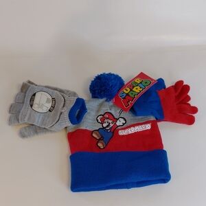 Nintendo Super Mario Red, Blue, and Gray Hat and Gloves Set