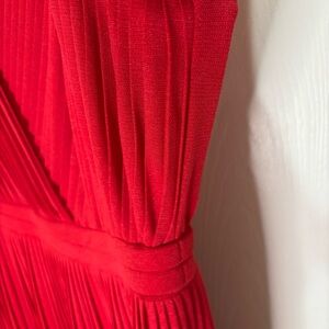 Dance the night away in this red pleated sleeveless midi dress. V-neck top, wrap style.