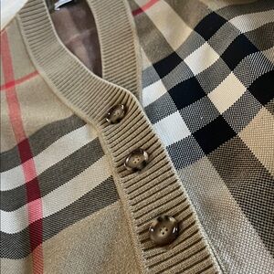 Chic Burberry cardigan with iconic check design. Soft wool blend. Perfect for layering.