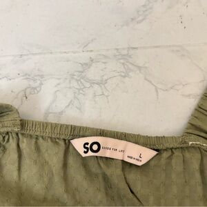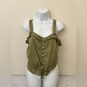 SO Sleeveless Blouse Juniors L Green Button Down Ruffle Top Waist Tie