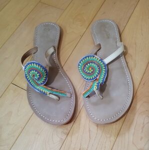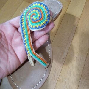 Seychelles seed bead toe wrap sandals women's size 8.5 GUC with a few blue seed beads missing but not noticeable. These are genuine leather and made in India. Thank you for stopping by and have a fabulous day 🤩! S27