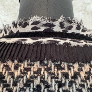 Chico’s multi-media jacket with tweed body, sweater sleeves and leopard print georgette ruffle. Tweed herringbone is a polyester, wool and acrylic blend…ribbed sweater sleeves are a cotton acrylic nylon blend. The leopard print lining is 100% polyester. Edges with pleated black ruffle, frayed leopard print georgette and black velvet ribbon.
