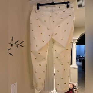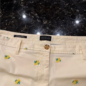 This is my favorite cropped pants from Talbots. Light yellow cream background with embroidered lemons. Overall length 35”