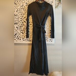 This full-length, long-sleeve dress in classic black features a minimalist wrap silhouette, a boatneck neckline with a cowl effect, and an elegant low back.