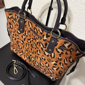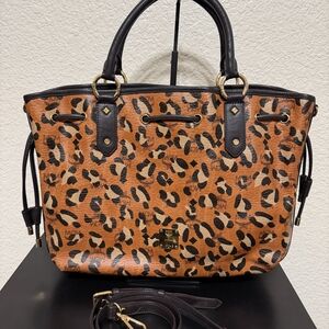 Chic MCM tote with striking leopard pattern. Features durable black handles and detachable strap. Ideal for everyday style.