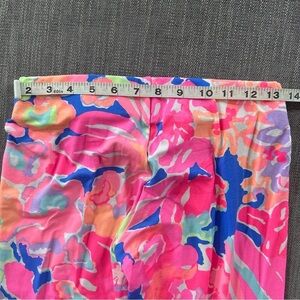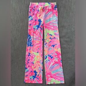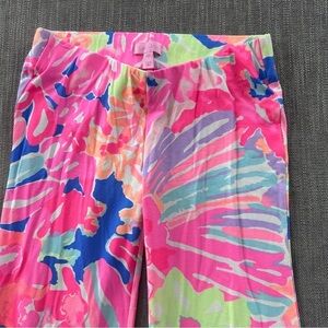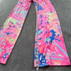 Lilly Pulitzer Georgia May Pallazo pants in Playa Hermosa. Pink watercolor like print. Wide leg. Elastic waistband. Fabric has a light stretch to it, could fit an xs/sm. See measurements. Very good condition.