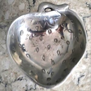 This STRAWBERRY SHAPED SILVER METAL BOWL is in GREAT preowned condition. Does have some discoloration on inside of bowl and remnants of a sticker on back.