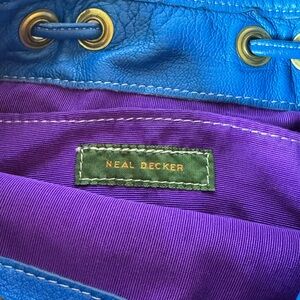 The bag comes with a blue leather handle/strap for easy carrying. The bag's interior is lined with purple canvas, featuring an inner pocket for additional storage. This vintage Neal Decker handbag is perfect for any business occasion and is sure to turn heads.