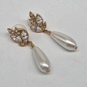 Gold Leaf & Faux Teardrop Pearl Drop Earrings Crystal Rhinestone 1.75"