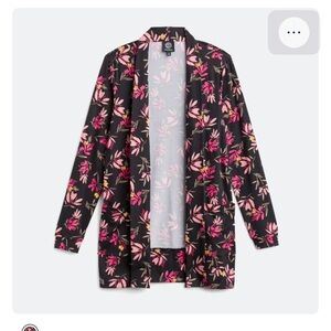 Stylish black cardigan with vibrant floral print. Features pink, red, and yellow flowers. Perfect for layering.