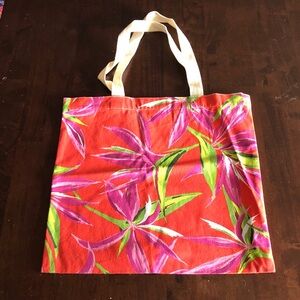 Brighten your day with this vibrant tropical canvas tote bag. Featuring a lively mix of orange red, pink, and green, it's perfect for any casual outing. Durable and stylish, this bag is a must-have accessory.