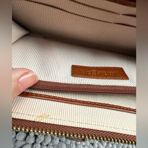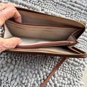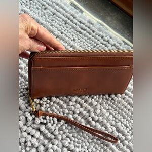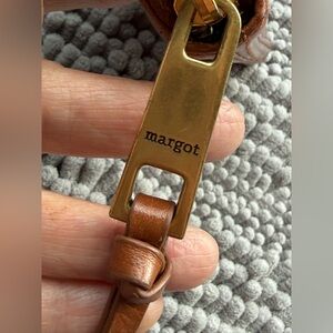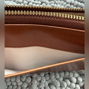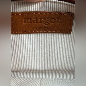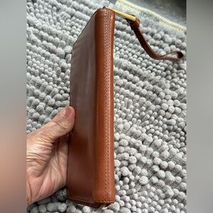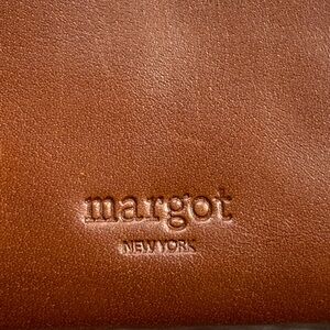 Inside lined, 2 leather topped lond slips, 8 cc slips, middle zipper, leather pull, small marke to right of inside Margot NY patch. Leather a beautiful brown, signs of very light use.