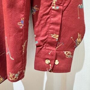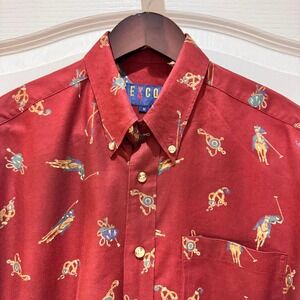 Keywords: EXCO shirt, mens red shirt, polo horse print, golf pattern shirt, button down shirt, long sleeve shirt, mens casual shirt, novelty print shirt, preppy shirt, golf apparel, equestrian theme, mens size M shirt, vintage inspired, unique pattern shirt