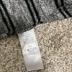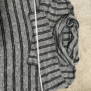 Cozy gray blouse with black stripes. Features a cowl neck design. Perfect for casual wear.