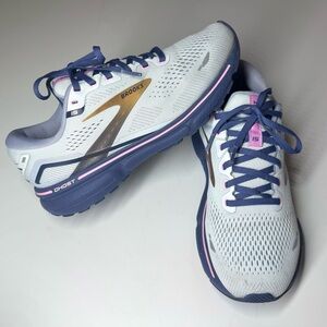 Sleek Brooks athletic shoes for women. Gray with blue and pink accents. Ideal for running.